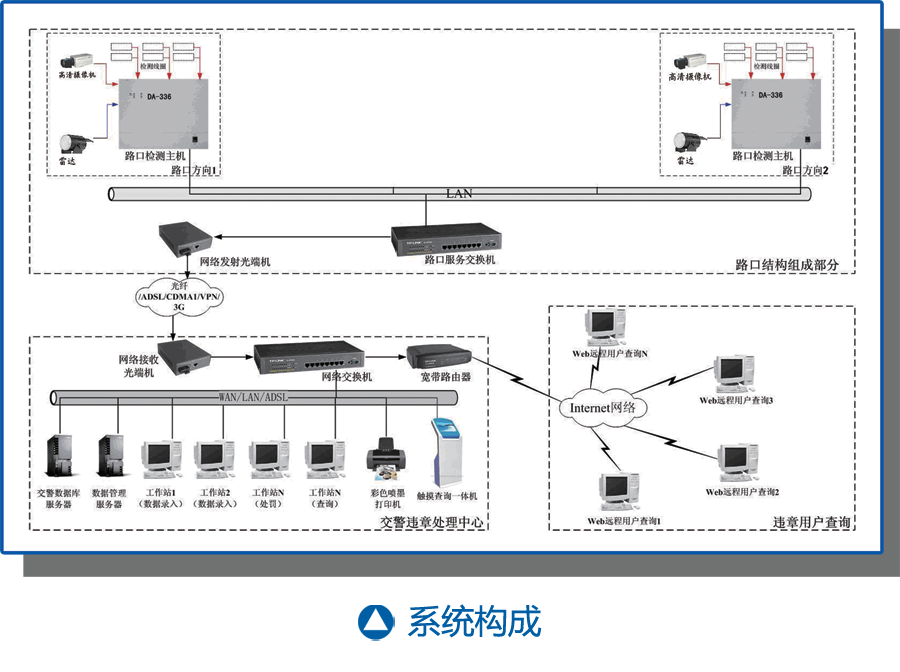 DA-366公路車輛智能監(jiān)測(區(qū)間測速)自動記錄系統(tǒng)由二套及以上的前端系統(tǒng)構(gòu)建區(qū)間測速點,準(zhǔn)確記錄通過車輛的時間及圖片,通過自動識別軟件提取車牌等相關(guān)信息,并將這些信息匯總到后臺服務(wù)器的數(shù)據(jù)庫處理。前端系統(tǒng)由車輛通過檢測單元、車輛通過監(jiān)控程序(儀表)、抓拍設(shè)備、主控程序、地感線圈組、閃光燈組件等部分組成。各個前端處理系統(tǒng)和后端系統(tǒng)以TCP/IP的方式組成局域網(wǎng),構(gòu)成完整的DA-356A區(qū)間測速自動記錄系統(tǒng)。前端采集到的車輛違法圖片被分類存儲在斷面服務(wù)器,圖片通過聯(lián)網(wǎng)將圖片傳送至后端系統(tǒng),完成車牌識別、入庫處理后,到達(dá)數(shù)據(jù)、控制中心,傳輸網(wǎng)絡(luò)可以是光纖、ADSL或其它有無線網(wǎng)絡(luò),并具備斷點續(xù)傳功能。